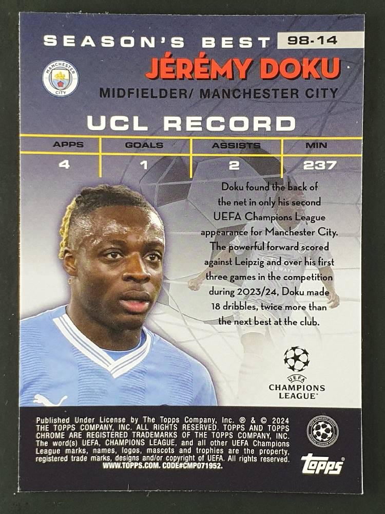 2023-24 Topps Chrome UEFA Club Competitions 1998 Topps Chrome Shooting Stars 98-14 Jeremy Doku [Raw]